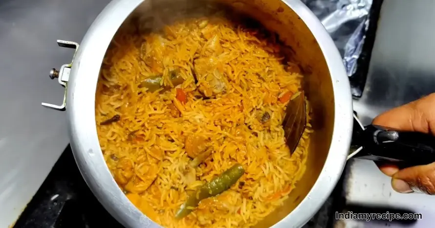 आप का चिकन बिरयान बन कर तैयार है कुकर को ठंडा होने दे फिर ढककन खोले और सर्व करे