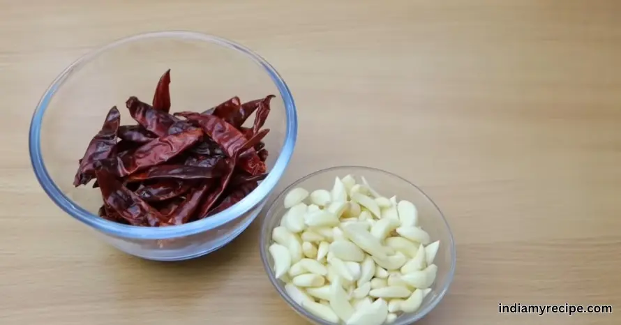 Lahsun Ki Chutney बनाने के लिए सबसे पहले 100 ग्राम लहसुन की कलियों को छीलकर एक बर्तन में रखें। इसके बाद 50 ग्राम सूखी लाल मिर्च को लें। अगर मिर्च अधिक तीखी हो तो उसके बीज निकाल लें ताकि यह मिर्च के तीखेपन को कम करेगा जिससे चटनी का स्वाद बैलेंस रहेगा।।